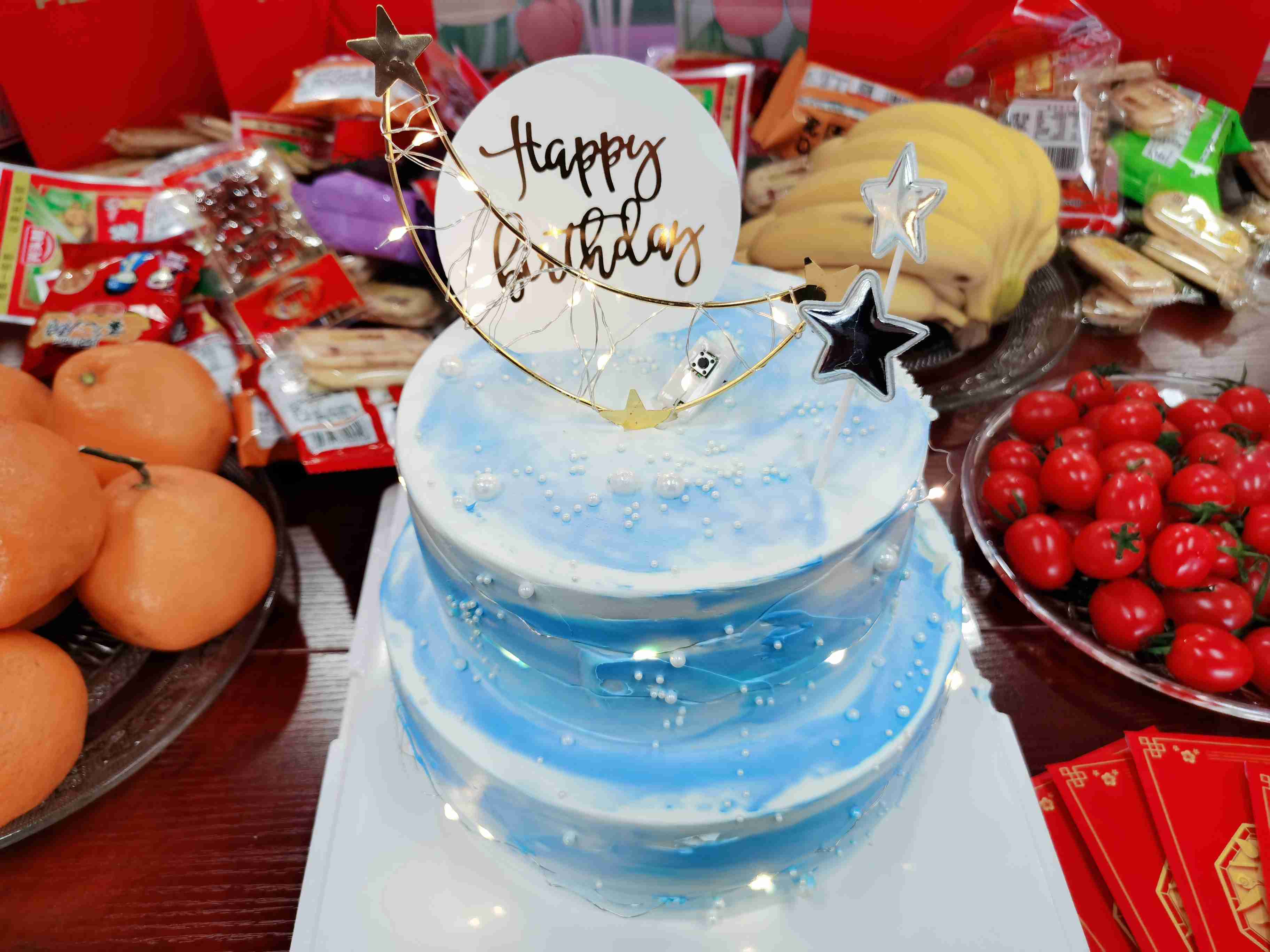 行政部精心布置了生日會的場地,并擺放了美味的食物,等待壽星和同事們的到來。食物誘人的香氣從桌子上彌漫開來,會場裝飾充滿了濃厚的節日氛圍。