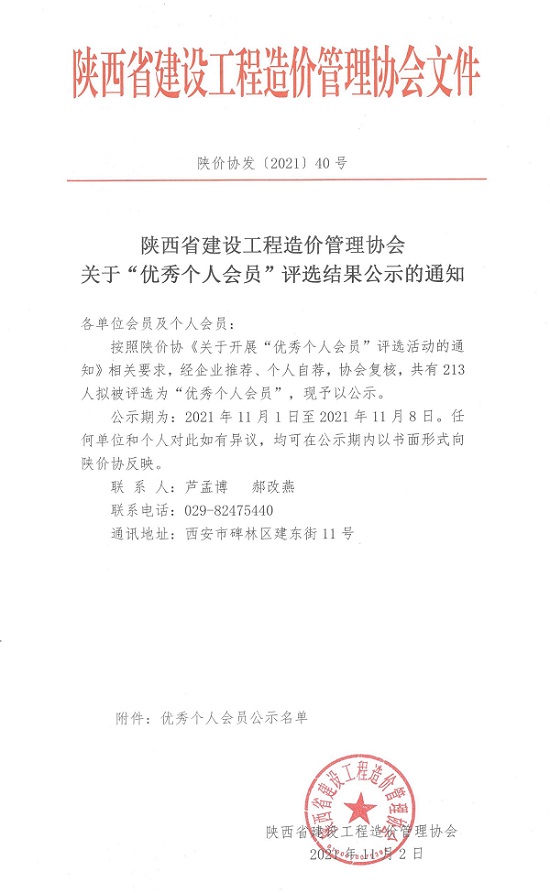 2021年11月2日,陜西省建設工程造價管理協會發布的《關于“優秀個人會員”評選結果公示的通知》,213位造價從業人員被評為“優秀個人會員”。本次評選活動不僅提高企業工程造價技術人員的綜合水平,還充分發揮了各造價企業對工程造價工作的大力支持和對優秀工程造價技術人員的肯定。