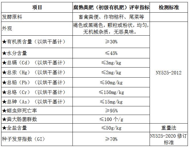 發酵腐熟初級有機肥必須是以利用畜禽糞便、作物秸稈、尾菜等農業廢棄物為原料,經過堆制充分發酵腐熟的堆肥,堆肥要求須符合NY/T3442-2019及其它相關要求,詳細如下: