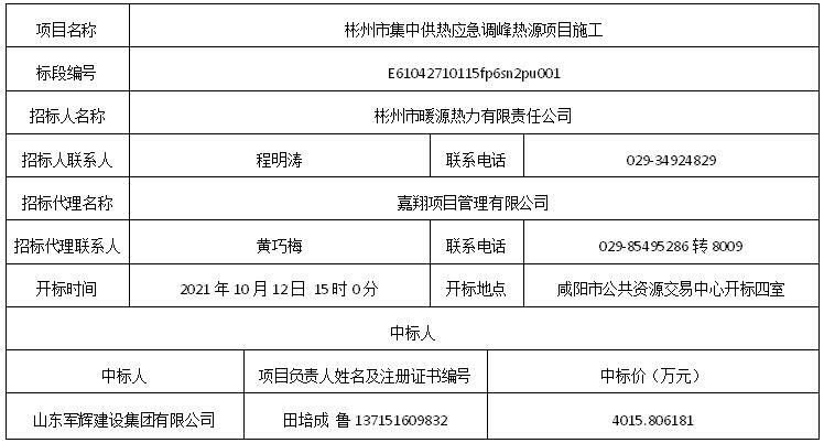 彬州市集中供熱應急調峰熱源項目施工中標結果公示
