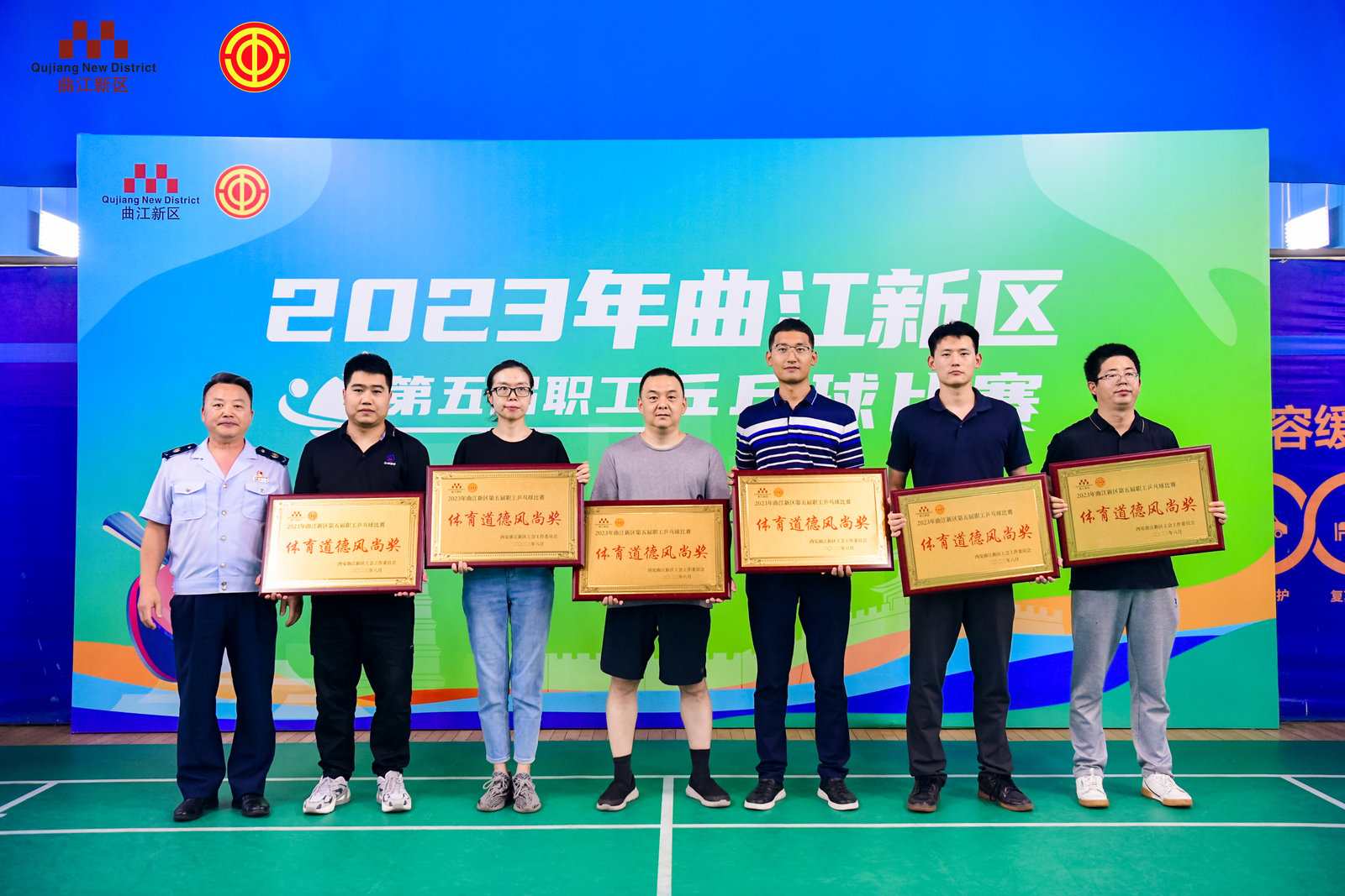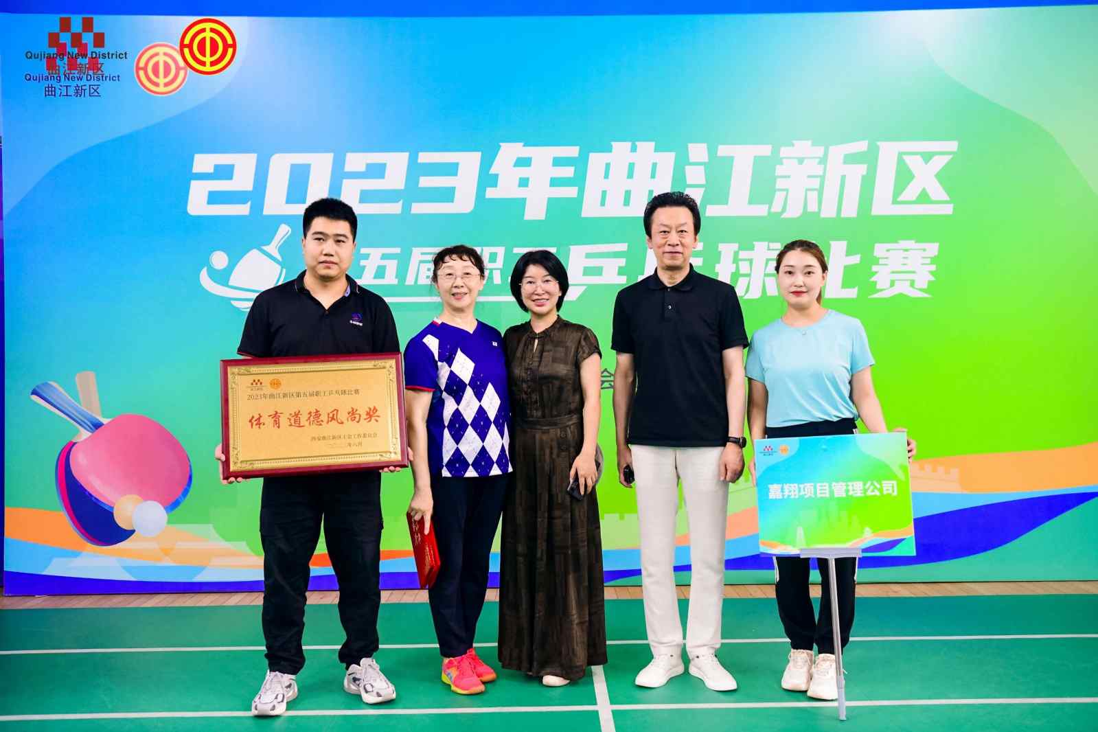 歷經2天的激烈角逐,2023年曲江新區第五屆職工乒乓球比賽在愛康羽毛球館圓滿落下帷幕。嘉翔項目管理有限公司榮獲“體育道德風尚獎”,曲江新區工會工委、各直屬工會、支撐體系單位工會相關負責同志參加閉幕式并頒獎。