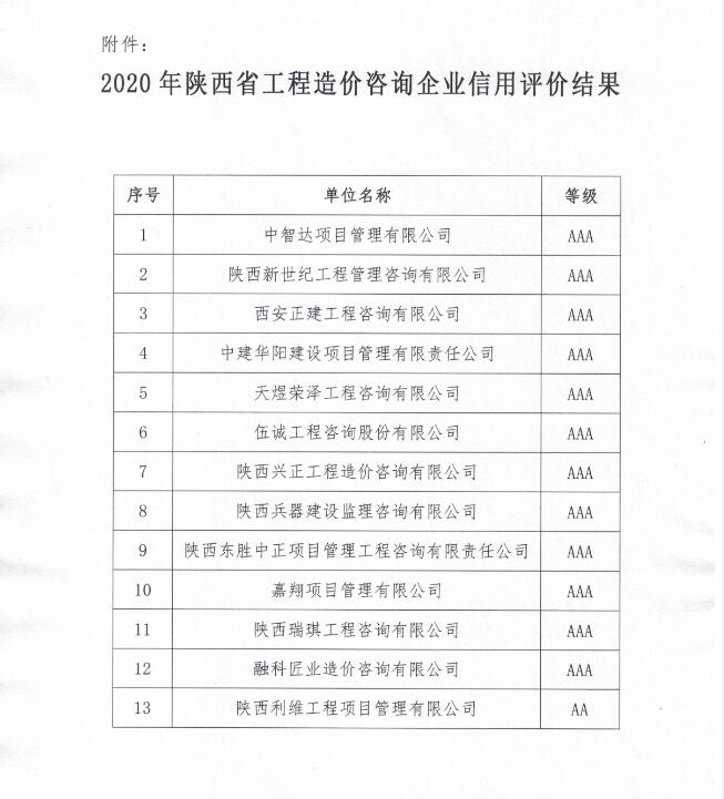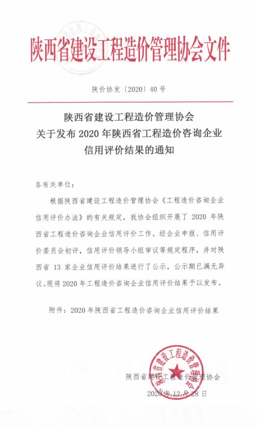 關(guān)于發(fā)布2020年陜西省工程造價咨詢企業(yè)信用評價結(jié)果的通知