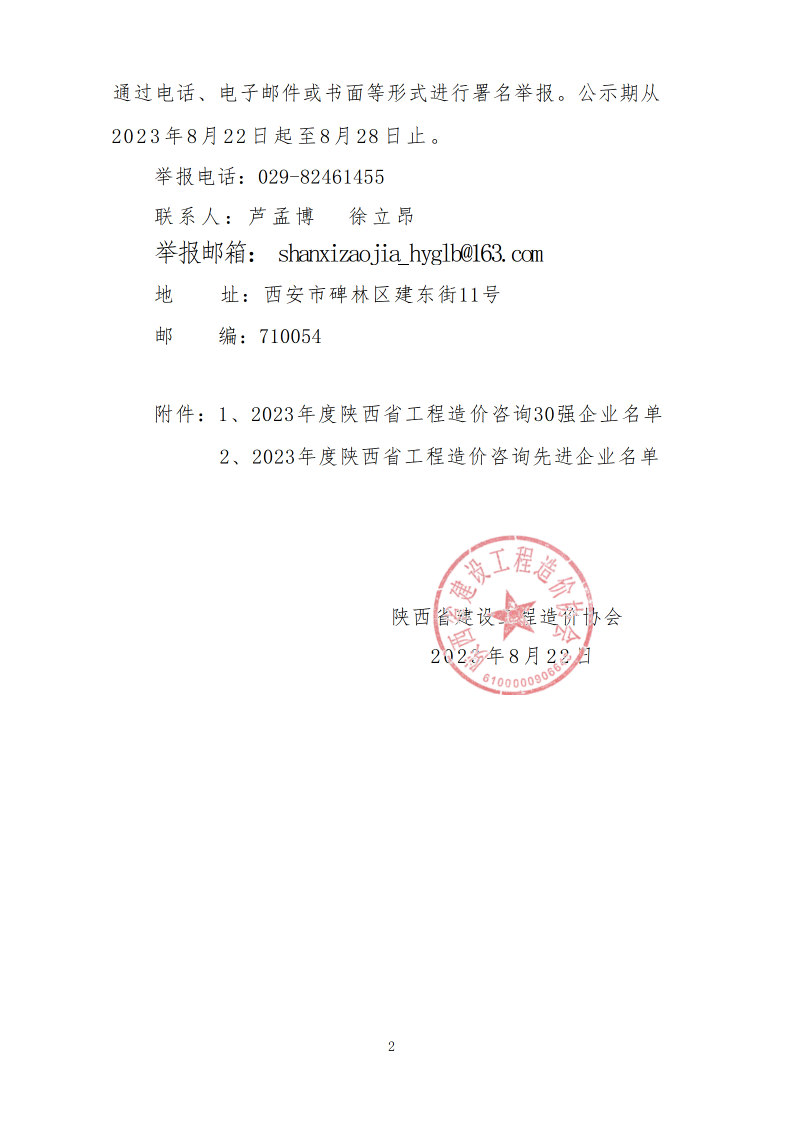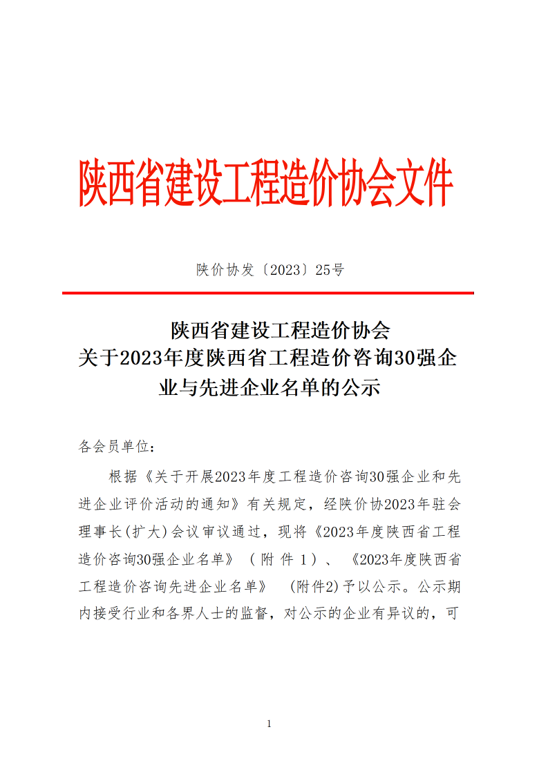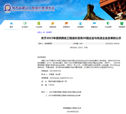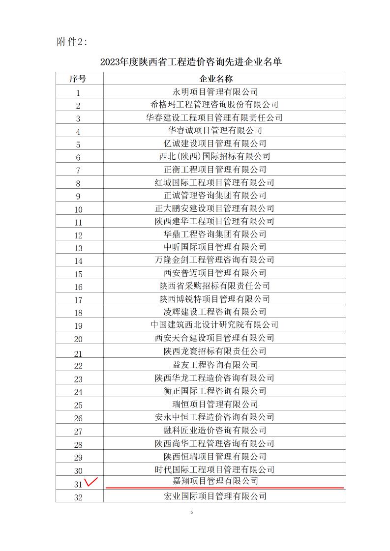 2023年8月22日陜西省建設工程造價管理協會發布了《關于2023年度陜西省工程造價咨詢30強企業 與 * 企業名單》的公示,嘉翔項目管理有限公司位列第31名,榮獲“陜西省工程造價咨詢 * 企業”的稱號。