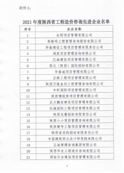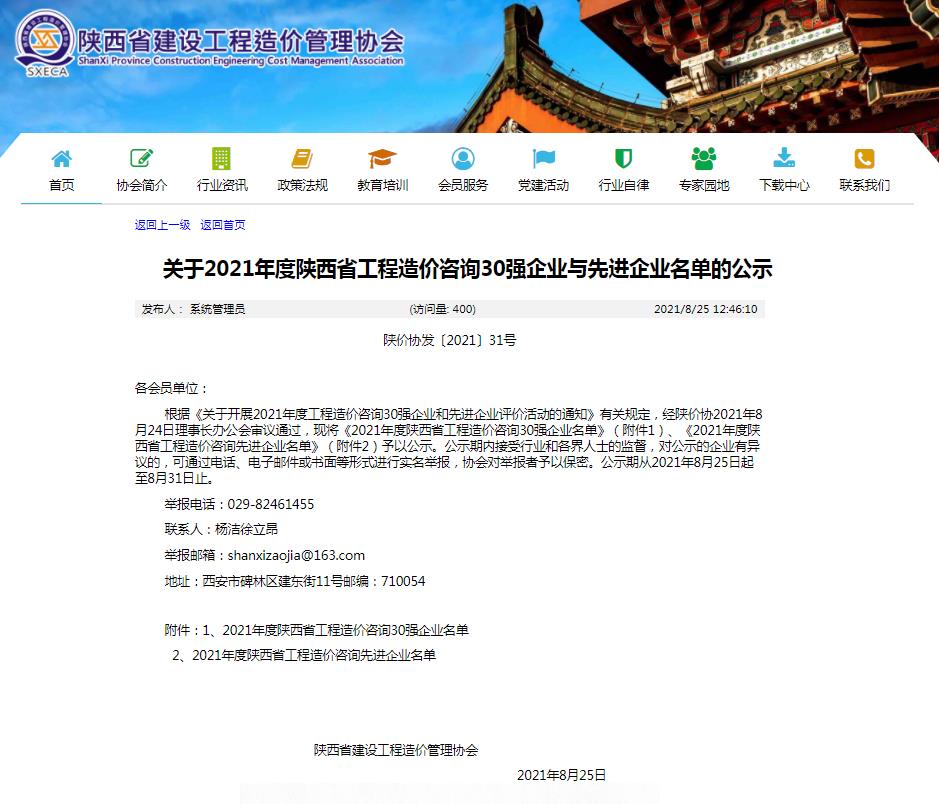2021年8月25日陜西省建設工程造價管理協(xié)會發(fā)布了《2021年度工程造價咨詢30強企業(yè)與先進企業(yè)名單》的公示,嘉翔項目管理有限公司位列第37名,榮獲“陜西省工程造價咨詢先進企業(yè)”的稱號。