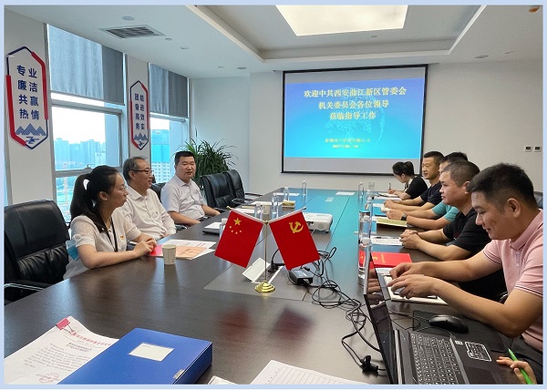 2021年8月19日下午,西安曲江新區管委會機關黨委書記、組織人事局副局長劉海旭、曲江新區團工委書記、組織人事局副局長鄭群凱、組織人事局干事李倩,到公司檢查、指導、調研黨建工作,公司董事長黃巧梅女士及領導班子,黨員寇輝、田飛龍同志等一行人陪同。